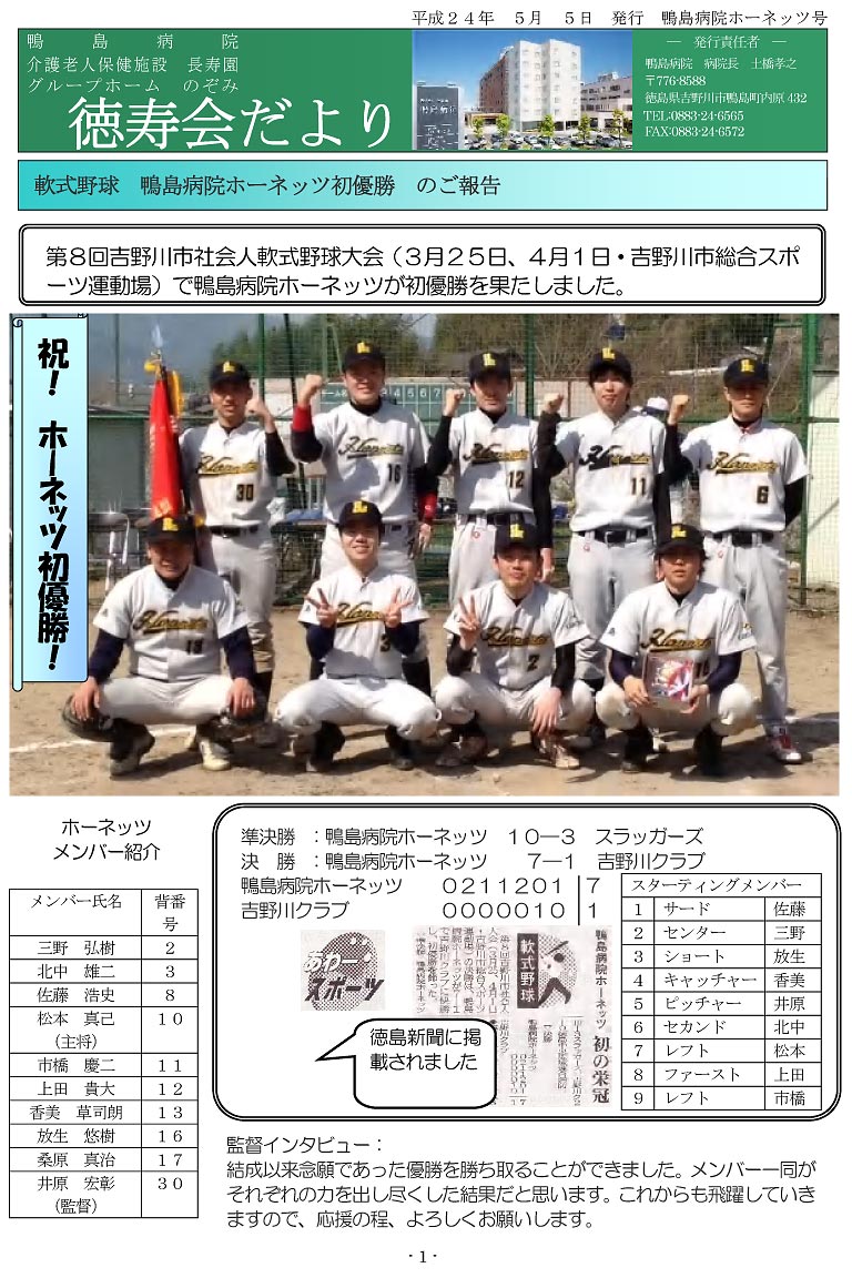 軟式野球 鴨島病院ホーネッツ初優勝のご報告